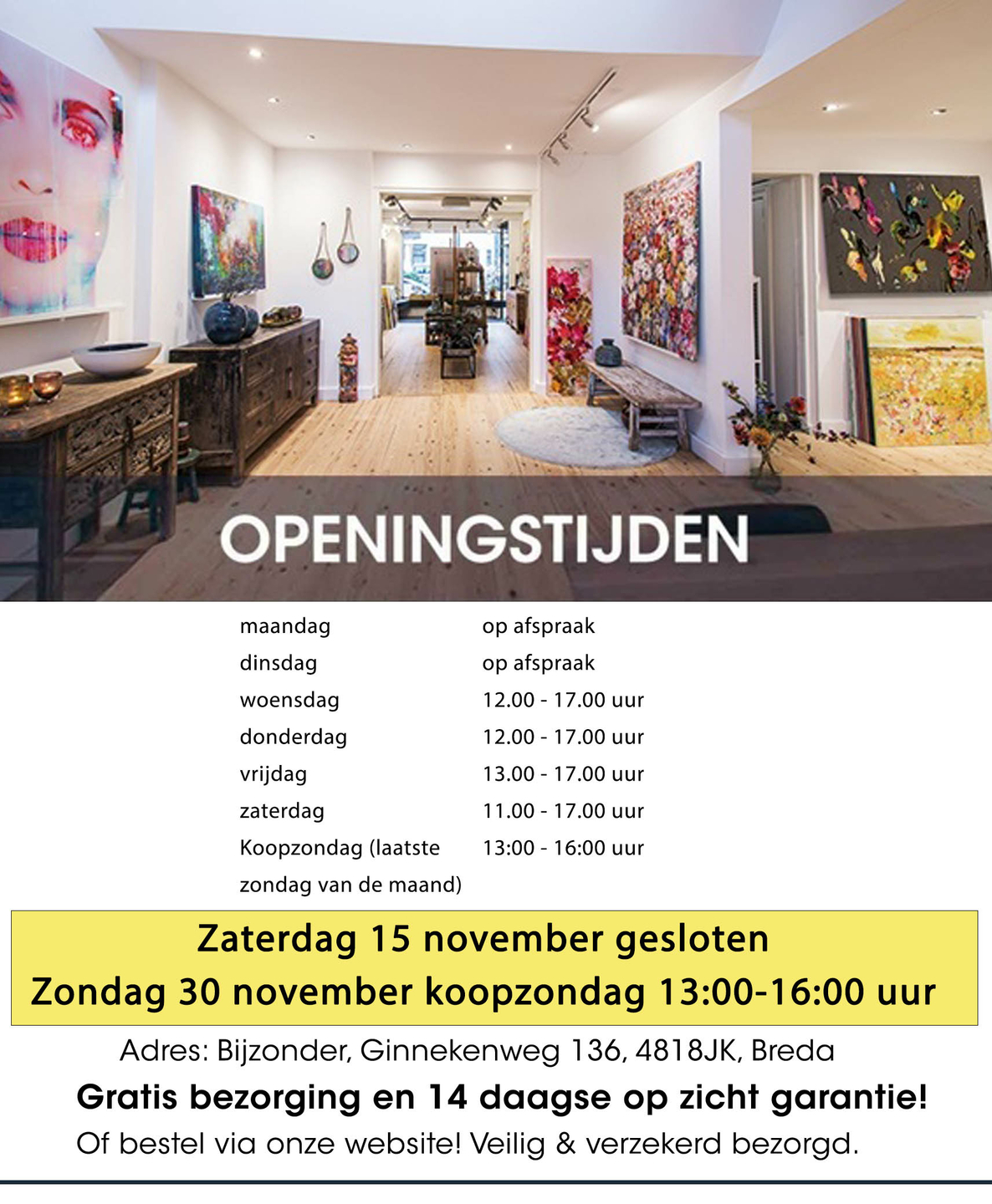 Telefoon:   076 889 4320 (ook buiten de openingstijden galerie zijn we vaak bereikbaar)